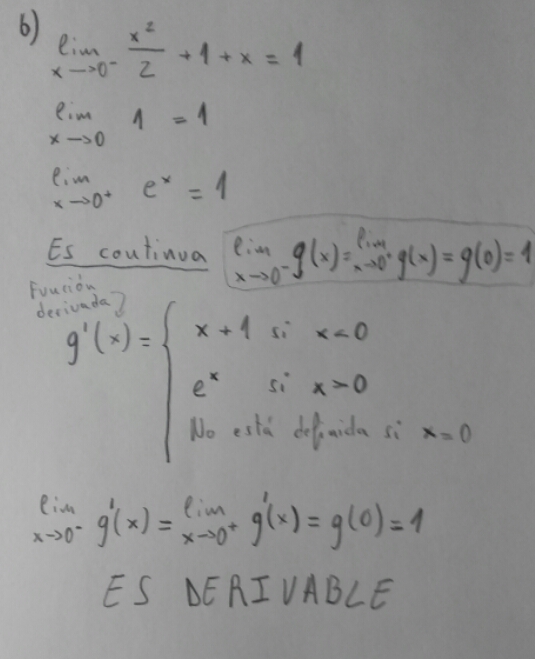 Lím(h-->0-) ( f(0+h) - f(0) )/h = Lím(h-->0) ( f(h) - 1 )/h = Lím(h-->0) ( h2/2 + 1 + h - 1 )/h = Lím(h-->0-) ( h(h/2 + 1) )/h = Lím(h-->0-) (h/2 + 1) = 1
