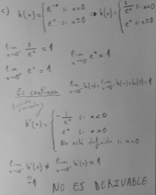En el ejercicio b) has mostrado bien que la función h(x) = e|x| es continua, y que los límites de las derivadas laterales no coinciden para x = 0, por lo que h ' (x) no está definida en dicho punto.