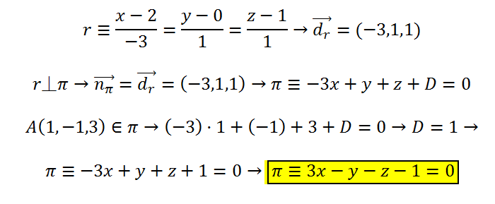b) Observa que el plano es perpendicular al vector director de la recta (cuyas componentes son los denominadores en los tres miembros de la doble igualdad en las ecuaciones cartesianas simétricas: (x-2)/(-3) = (y-0)/1 = (z-1)/1), por lo que un vector normal al plano puede ser dicho vector, por lo que tenemos: