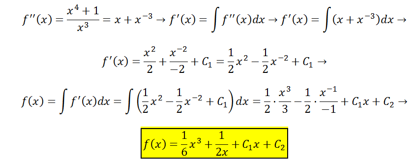 Hola queria saber si me pueden ayudar con este problema. Me pide encontrar f(x) y me da como dato la segunda derivada f''(x)=(x^4+1)/x^3 Por favor si pueden ayudarme le agradeceria muchisimo porque no entiendo como hacerlo