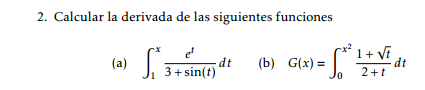 a) Tienes: f(t) = e^t / (3 + sent), y los límites de integración son: a = 1, u(x) = x, cuya derivada queda: u ' (x) = 1,