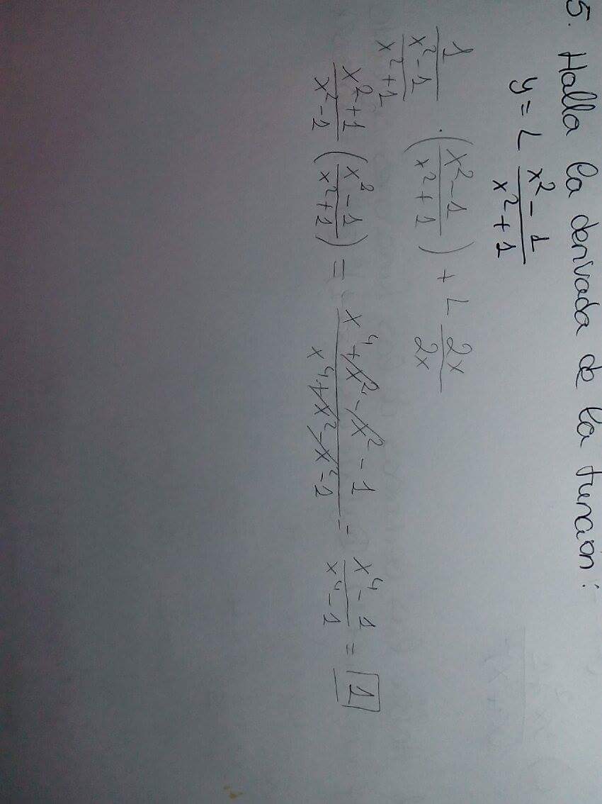 y ' = ( 1/(x² - 1) )*2x - ( 1/(x² + 1) )*2x = 2x/(x² - 1) - 2x/(x² + 1) = extraemos factor común:
