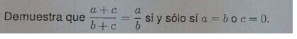 (a+c)/(b+c) = a/b → propiedad uniforme → b(a+c) = a(b+c) → propiedad distributiva → ba + bc = ab + ac → propiedad conmutativa → ab + bc = ab + ac → propiedad cancelativa →