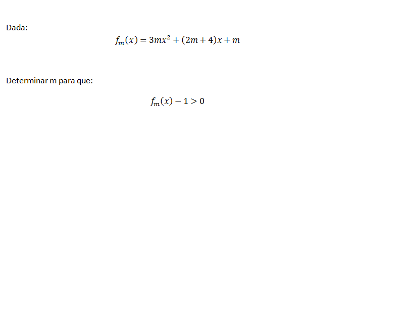 observa que se trata de una función polinómica cuadrática, y nos piden hallar m para que tome valores estrictamente positivos, por lo que necesitamos que la curva sea cóncava hacia arriba, y que su vértice se encuentre por encima del eje OX en un sistema de coordenadas cartesiano.