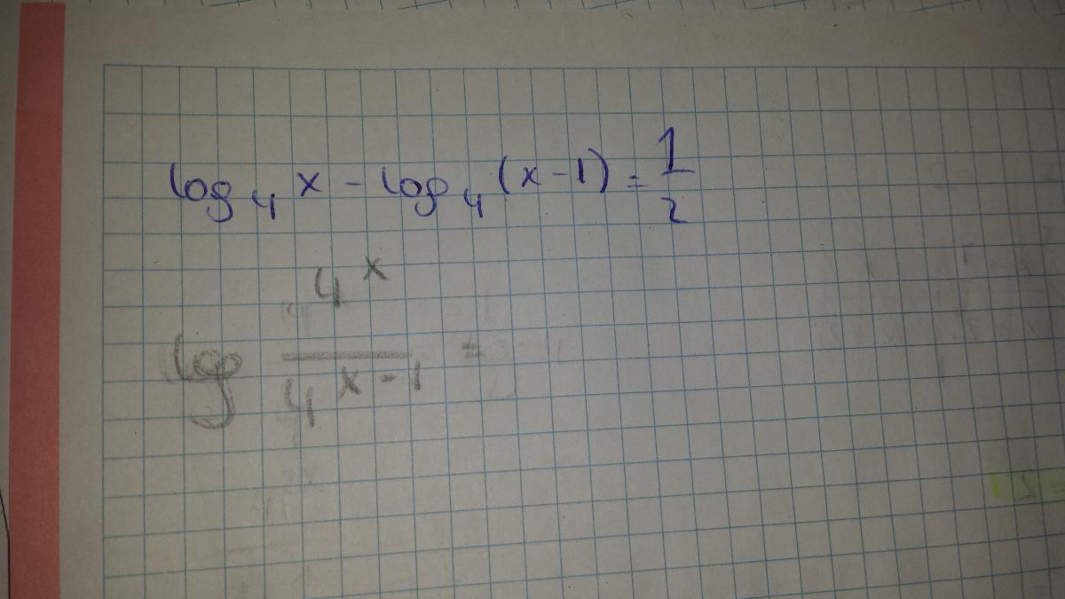 LOG( x / (x-1) ) = 1/2, componemos con la función inversa del logaritmo en base cuatro (recuerda que es la función exponencial con base 4):