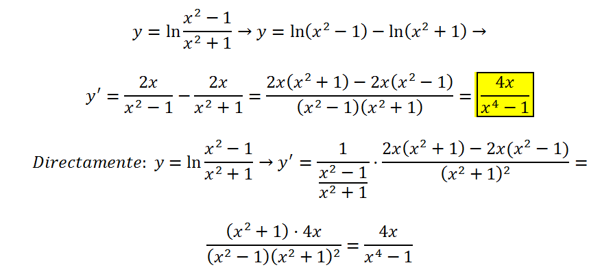 y = ln(x² - 1) - ln(x² + 1), luego derivamos término a término (observa que debemos aplicar la regla de la cadena: