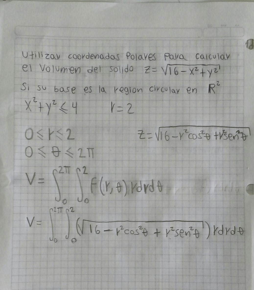 V = ∫∫ V(16 - r:²)rdrdθ , con 0 ≤ θ ≤ 2π y 0 ≤ r ≤ 2.