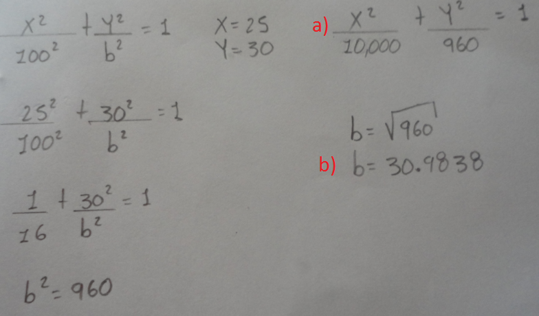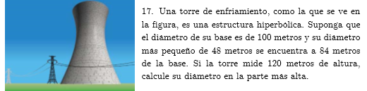Luego, observa que el punto de contacto entre la base de la estructura y el suelo (consideramos el punto de la derecha), tiene coordenadas: P(50,-84) (recuerda cómo hemos ubicado el origen de coordenadas de nuestro sistema cartesiano), reemplazas en la ecuación de la hipérbola y queda: