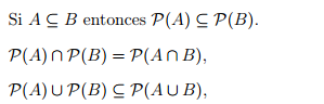 2) Sea X ∈ P(A) ∩ P(B) ↔ por definición de intersección ↔ X ∈ P(A) ∧ X ∈ P(A) ↔ por definición de conjunto de partes ↔ X ⊆ A ∧ X ⊆ B ↔ X ⊆ A ∩ B ↔ X ∈ P(A ∩ B ), por lo tanto:
