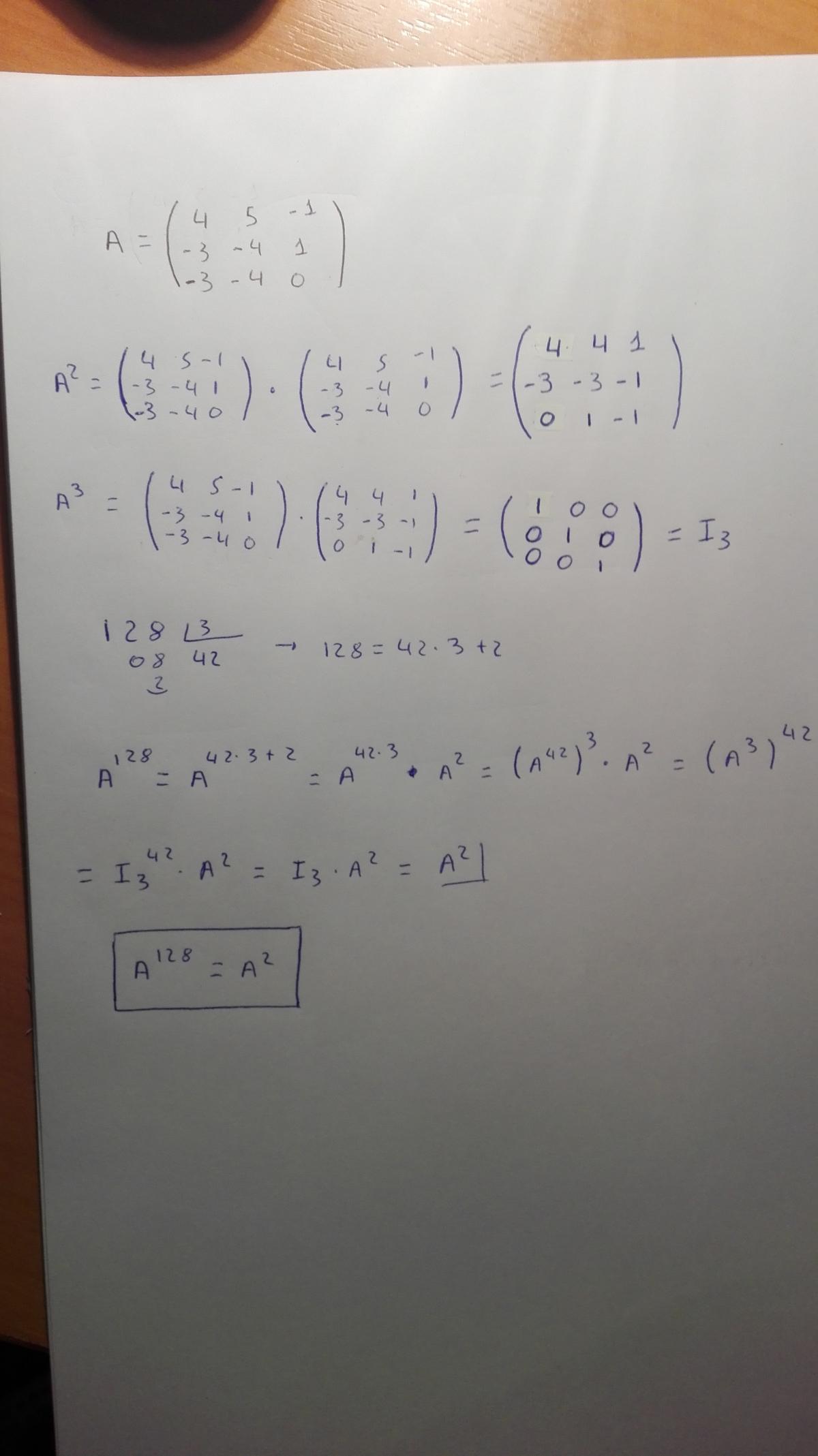 Buenas, tengo una pregunta sobre un ejercicio de matrices. El ejercicio me pide A^128, siendo la matriz (4 5 -1)