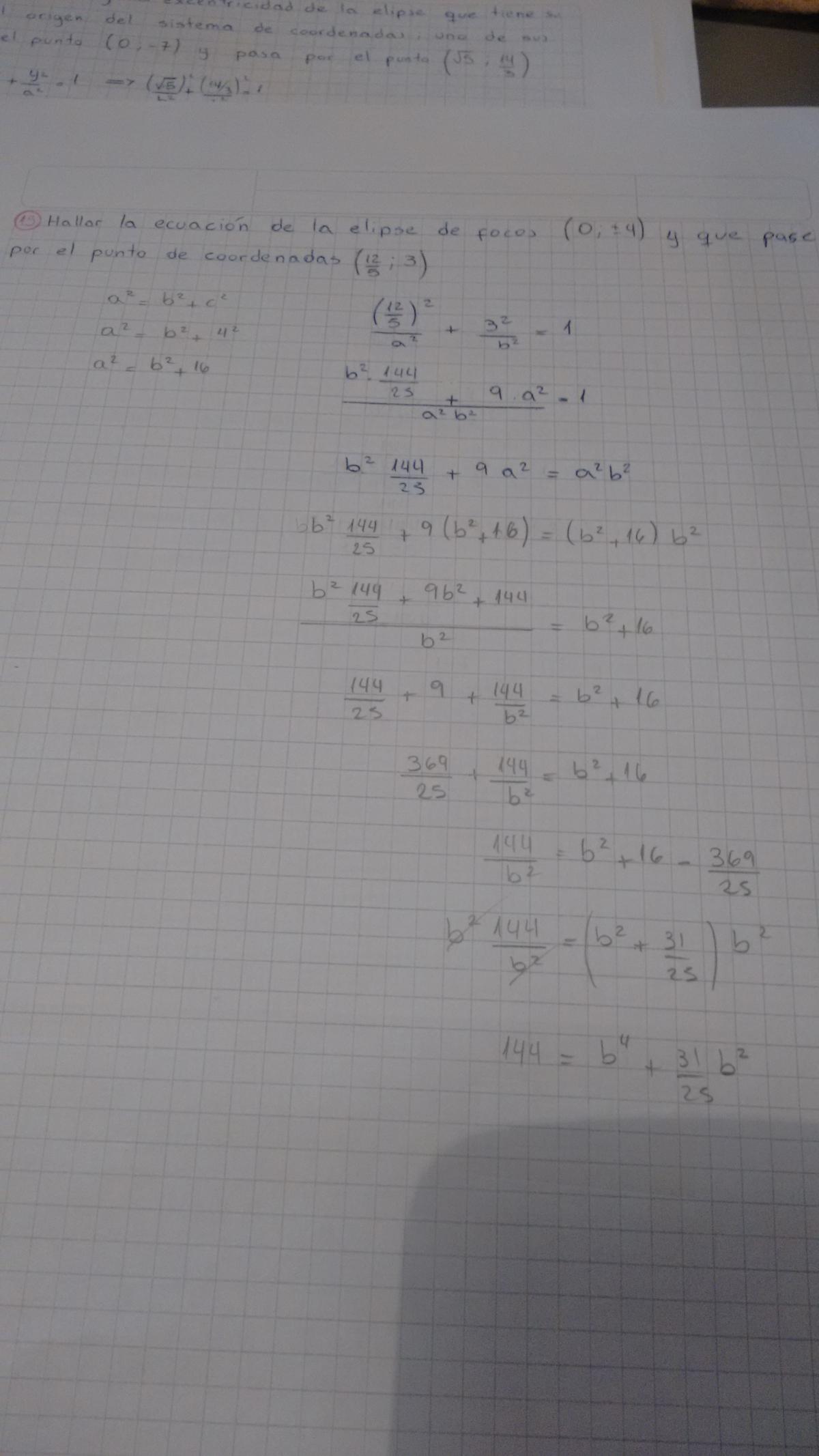 (12/5)²/a² + 3²/b²=1... 144/(25a²) + 9/b²=1... (144b² + 9.25a²)/(25a²b²)=1... 144b² + 9.25a²=25a²b²..