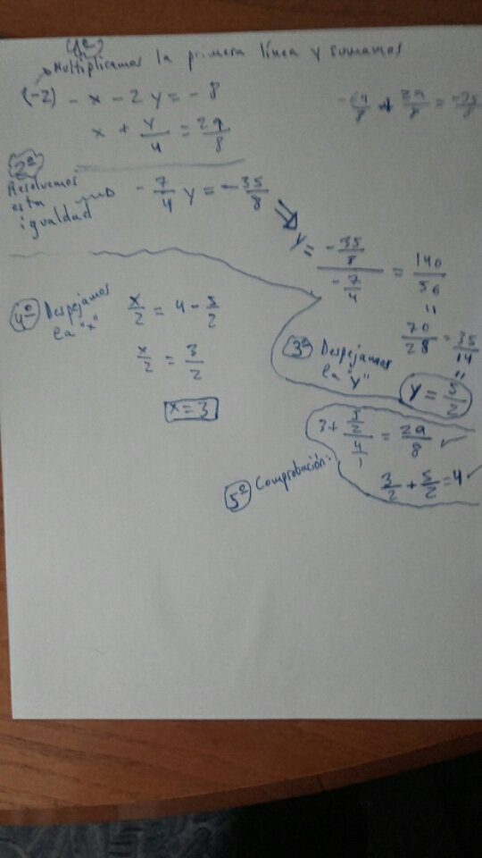 Luego, la solución del sistema es: x = 3, y = 5/2.