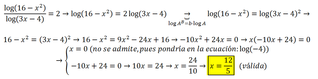 log(16-x²) = 2log(3x-4), luego aplicas la propiedad del logaritmo de una potencia y queda