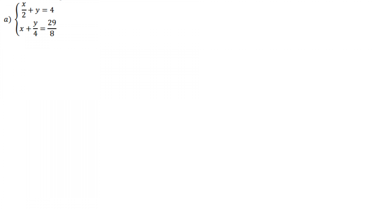 Comencemos por multiplicar por 2 en todos los términos de la primera ecuación, y por 8 en todos los términos de la segunda ecuación, y el sistema queda: