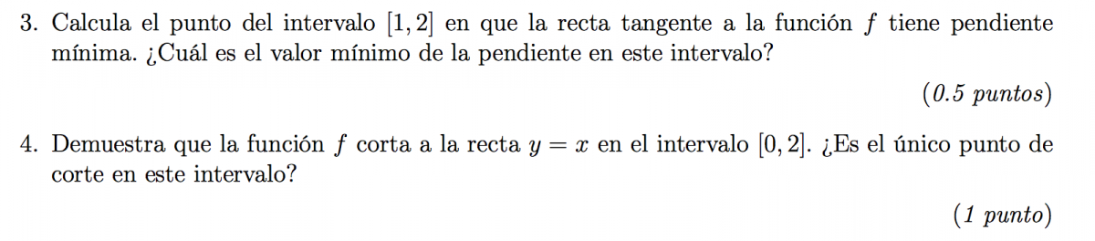 Para el 4), si existe algun pùnto de corte entre f(x)=(1+x)/e^x e y=x, debe cumplirse que (1+x)/e^x = x... de donde (1+x)/e^x - x = 0