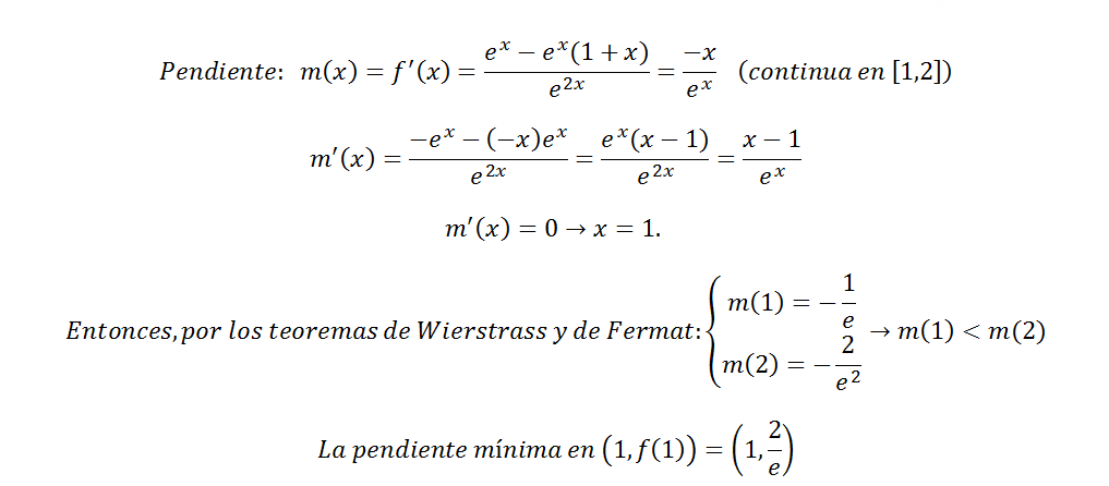 Para el 3), la pendiente se obtiene derivando f(x). Será [e^x - e^x.(1+x)] / (e^x)² = (e^x-e^x-x.e^x)/ (e^x)² = -x.e^x/ (e^x)² = -x/ e^x, que podríamos llamar m(x), expresion que relaciona el valor de x con la pendiente de f(x)... Te sugiero.. Derivada de una multiplicacion y una division 01