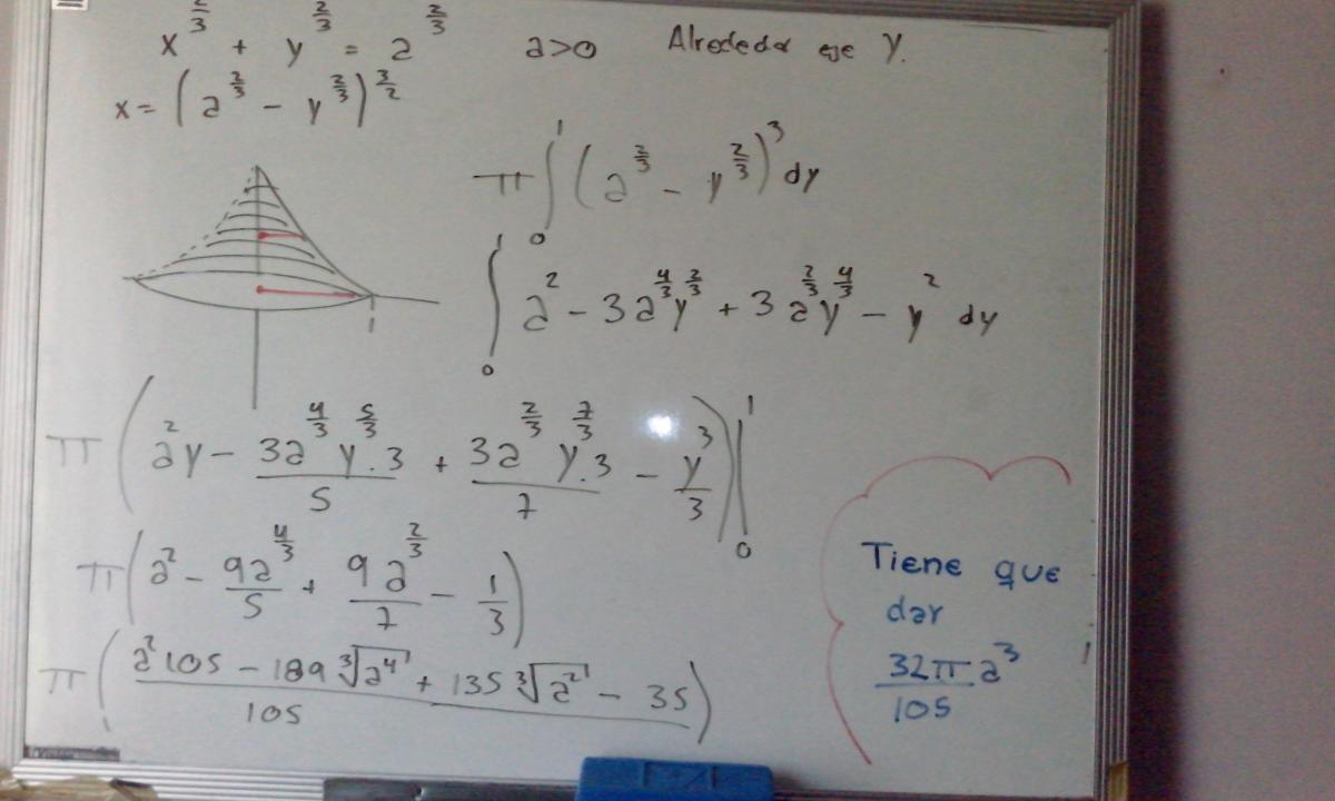 Hola, necesito ayuda con este ejercicio, tengo que hacer rotar alrededor del eje Y esa funcion pero no me da el resultado del libro, no se si tampoco lo grafique bien. Despeje la X y la eleve al cuadrado y luego calcule la integral. Creo que no se ve bien a que esta elevado la funcion, asi que aclaro: el x,a,y estan elevados a la 2/3![]()