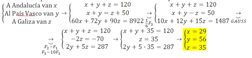 A 120 alumnos de Bachillerato se les subvenciona una excursión con destino a las comunidades de Andalucía, Galicia y País Vasco, con un total de 8 922 €. Se asignan 60 € a cada alumno con destino a Andalucía, 72 € a cada uno que vaya al País Vasco y 90 € a los que se