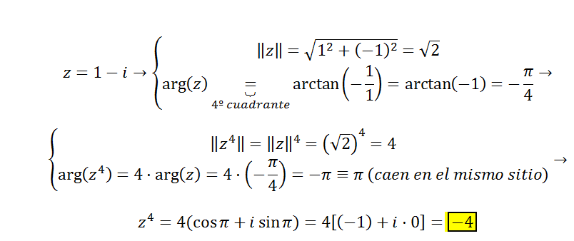 Expresa (1-i) en forma trigonométrica y utiliza la fórmula de Moivre para obtener el valor de la potencia: (1-i)4