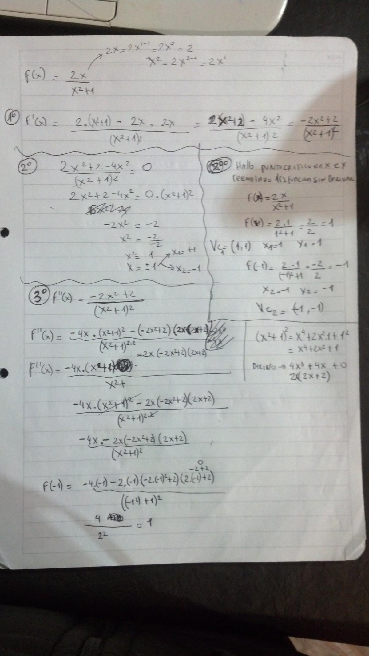 estoy horas con este ejercicio de maximos y minimos 2x/x²+1 ... no me sale el resultado de la segunda derivada.. ![]()