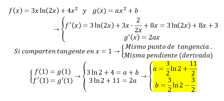 Dadas las funciones f(x) = 3xln(2x)+4x 2 y g(x) = ax2+b , determinar los valores de a y b para que ambas funciones tengan la misma recta tangente en x = 1.