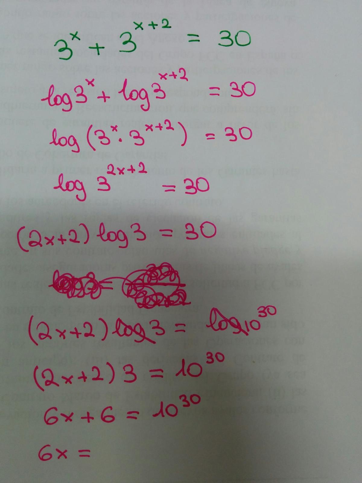 En la primera línea, si quisieras ponerlo en función de logaritmos tambien tendrias que aplicarlo al 30 del otro lado de la igualdad (cosa que no has hecho y por lo tanto es incorrecto)...entonces nos quedaria el log1030, que no nos conviene...ya que "un número que sea el exponente de 10 y nos dé como resultado 30" tiene decimales y nos lo complicaría más.