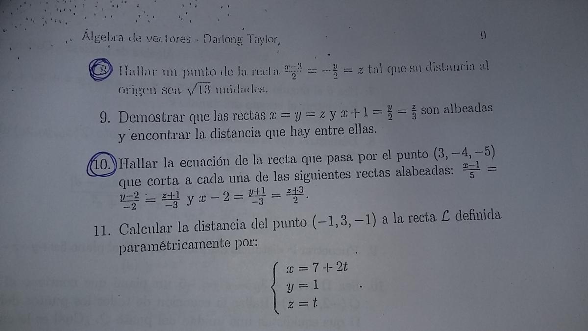 Hola, buenas noches, me podrían ayudarme con estos 2 problemas de análisis matemático 2 por favor? En el problema 8 mi duda es como conseguir el punto que me piden, si solo tengo una ecuación( distancia punto-recta) y 3 incógnitas (x,y,z), y el problema 10 no se como hacerlo. Gracias de antemano.