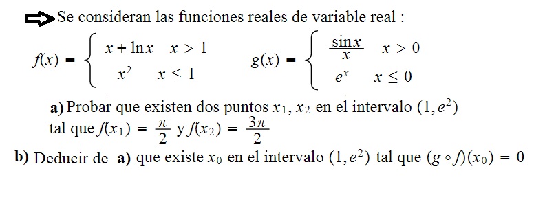 Por tanto gof(x)= sen(x+lnx) / (x+lnx). Y de nuevo, Bolzano.. . Tendrás que demostrar, por supuesto que f(x) y gof(x) y g(x) son continuas en el intervalo (1,e²).