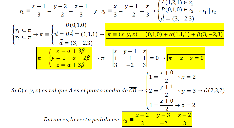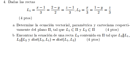 Luego, hacemos lo propio con las ecuaciones cartesianas simétricas de las rectas cuyas ecuaciones tenemos en el enunciado (las llamamos L1 y L2):