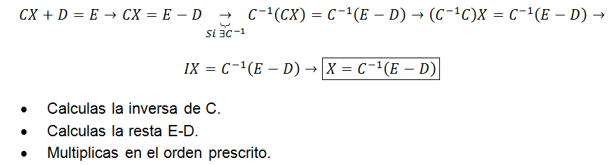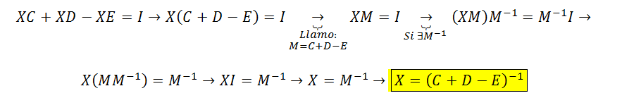 resuelve la ecuacion matricial (e) X·C + X·D - X·E = I ; seria asi? X(C+D-E) : X=-C-D+E : No se si lo estoy haciendo bien gracias