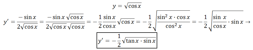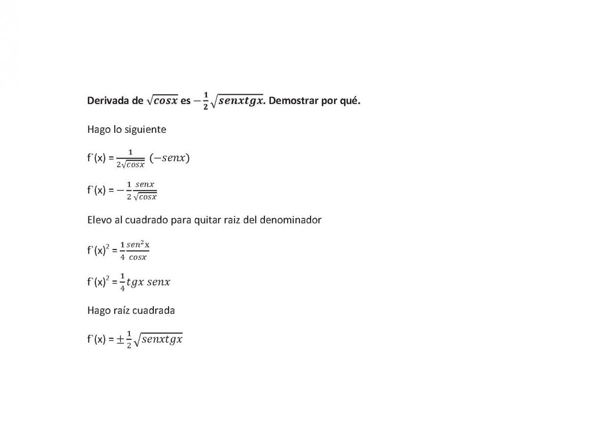 Les dejo un ejercicio sobre la deriva de √cosx y lo que he hecho al respecto. Me dice que la solución es - ½√senxtgx pero a mi me sale que sería ± ½√senxtgx