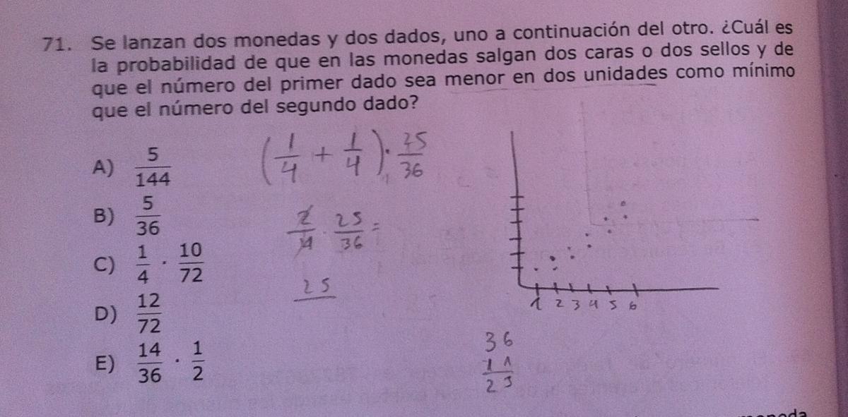 por lo que tenemos que la probabilidad de sacar un número en el primer dado que sea menor que el número del segundo en al menos en dos unidades es: