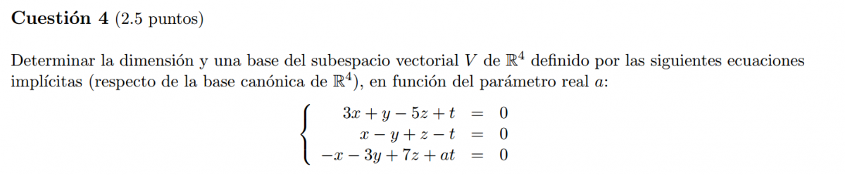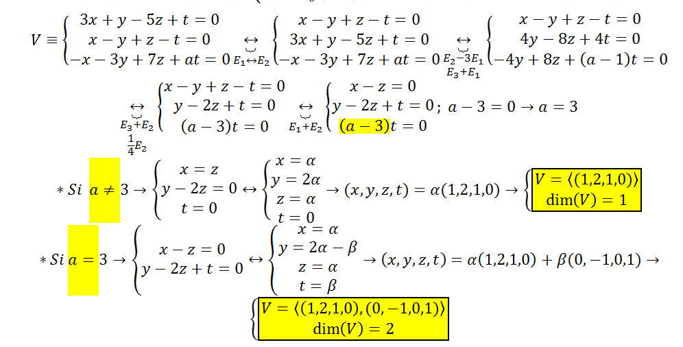 Buenas noches, tengo todo el ejercicio resuelto. Si a = 3 dim V = 2 y su base (1,2,1,0) sin embargo me falta que si a ≠ 3 entonces dim v= 1 pero no sé sacar la base en función del parámetro 'a' ayuda por favor; sé que la duda corresponde a la universidad pero es que me urge.