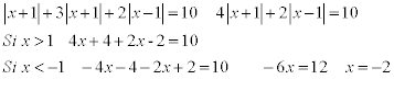 3) x < -1 y x >= 1, y la tercera: - 4x - 4 + 2x - 2 = 10, de la que podemos despejar: x= 8/3, que no cumple con la primera condición, por lo que no es parte de la solución.
