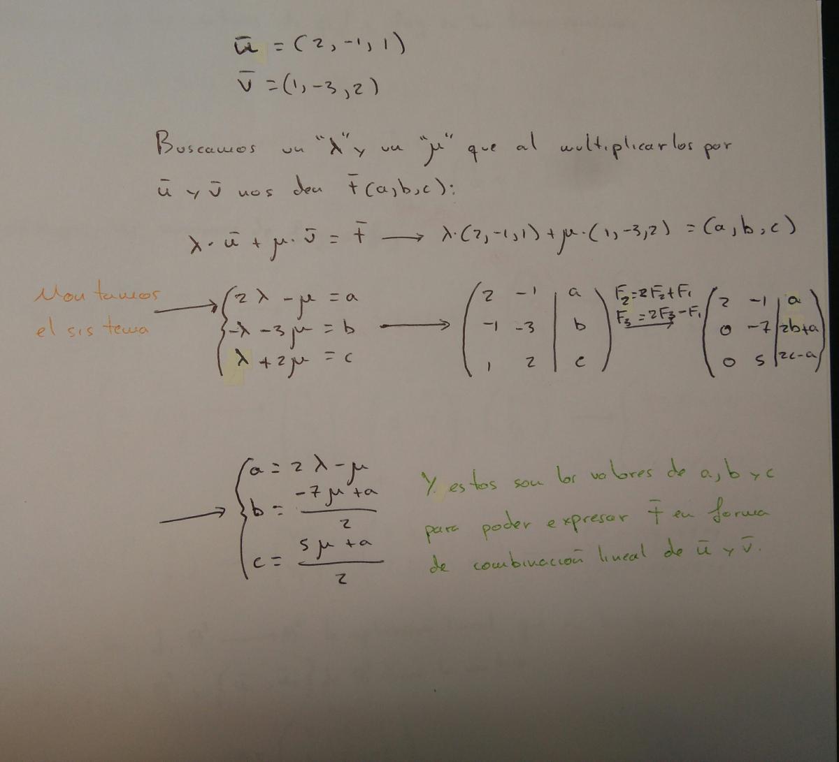 A ver Sebastian creo que la solución del ejercicio es encontrar un x1 y un x2 que multiplicados por los vectores u1 y u2 nos de el vector t. De esta forma tendrás el verctor t(a,b,c) como combinación lineal de u1 y u2.