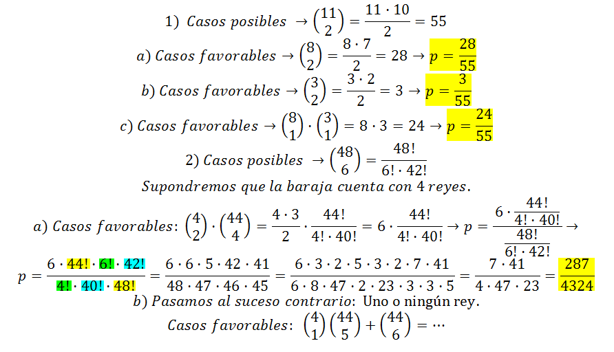 En todos los casos hemos considerado que las cartas se extraen de la baraja sin orden.