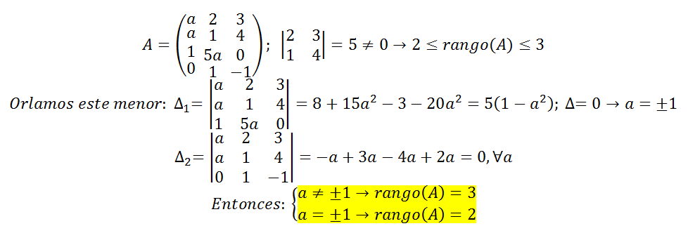 F = -1 que es distinto de cero, por lo que tenemos que el rango será 2, para a = 1.