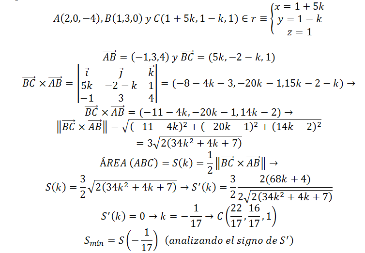 |BA x BC| = V(672k^2 + 64k + 30), observa que es una expresión en función de una variable k, luego sustituimos en la expresión del área señalada (*) y obtenemos la expresión del área del triángulo en función de la variable k: