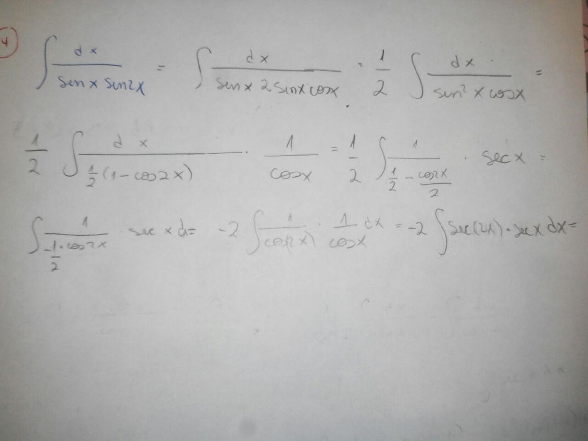 I = (1/2) * Integral ( 1 / ( (senx)^2 * (cosx)^2 ) ) * cosx*dx = por identidad trigonométrica =