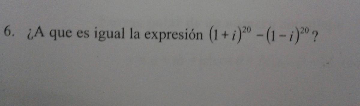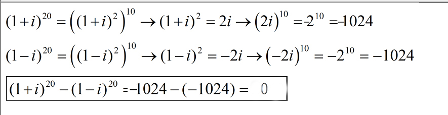 z2^20 = 1024*(cos180° + i*sen180°) = reemplazamos valores = 1024*(-1 + 0i) = -1024.