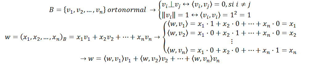 hola, tengo una duda sobre algebra lineal, me podrian explicar de donde se deduce esto, sea B base ortonormal= {v1, v2..., vn} y el vector W se cumple que : W= <w.v1>v1 + <w.v2>v2+..+<w.vn>vn