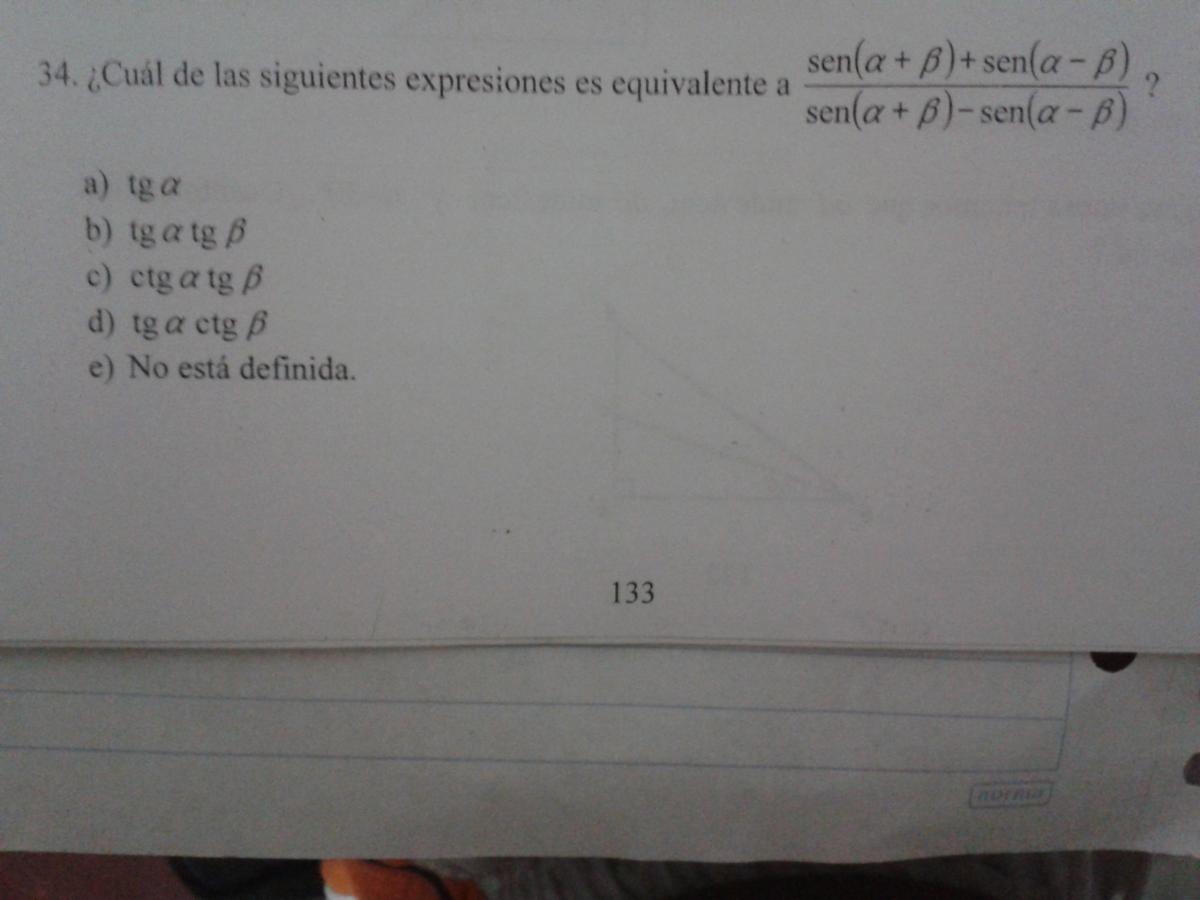 N = sen(a+b)+sen(a-b) = sena*cosb+cosa*senb + sena*cosb-cosa*senb = cancelamos términos opuestos y reducimos términos semejantes = = 2*sena*cosb.
