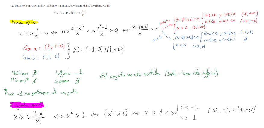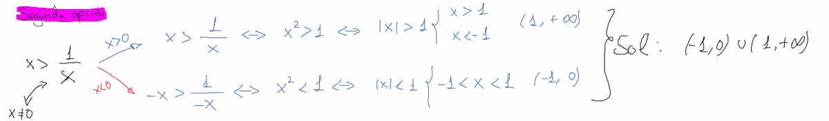 A partir de la inecuación x > 1/x, debes considerar dos opciones: x > 0 y x < 0, desarrollas ambas y obtendrás subintervalos del intervalo solución.
