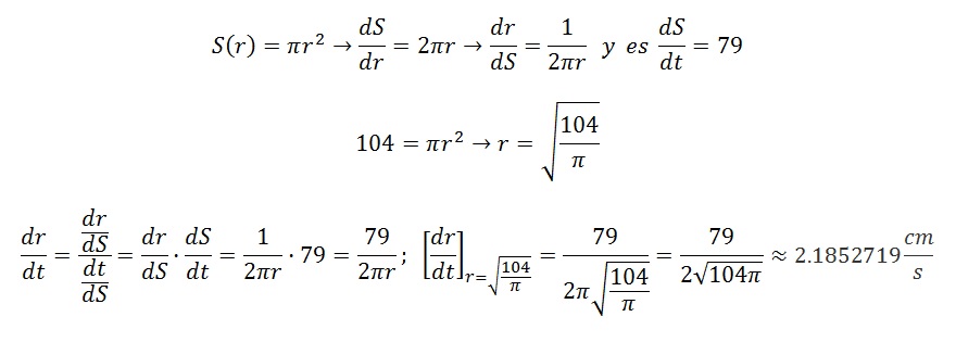 Tenemos un círculo cuya área aumenta a una velocidad constante de 79 centímetros cuadrados por segundo. En el momento en que el área es igual a 104 cm 2 , ¿cuál es la velocidad a la que aumenta su radio (en cm / s)?