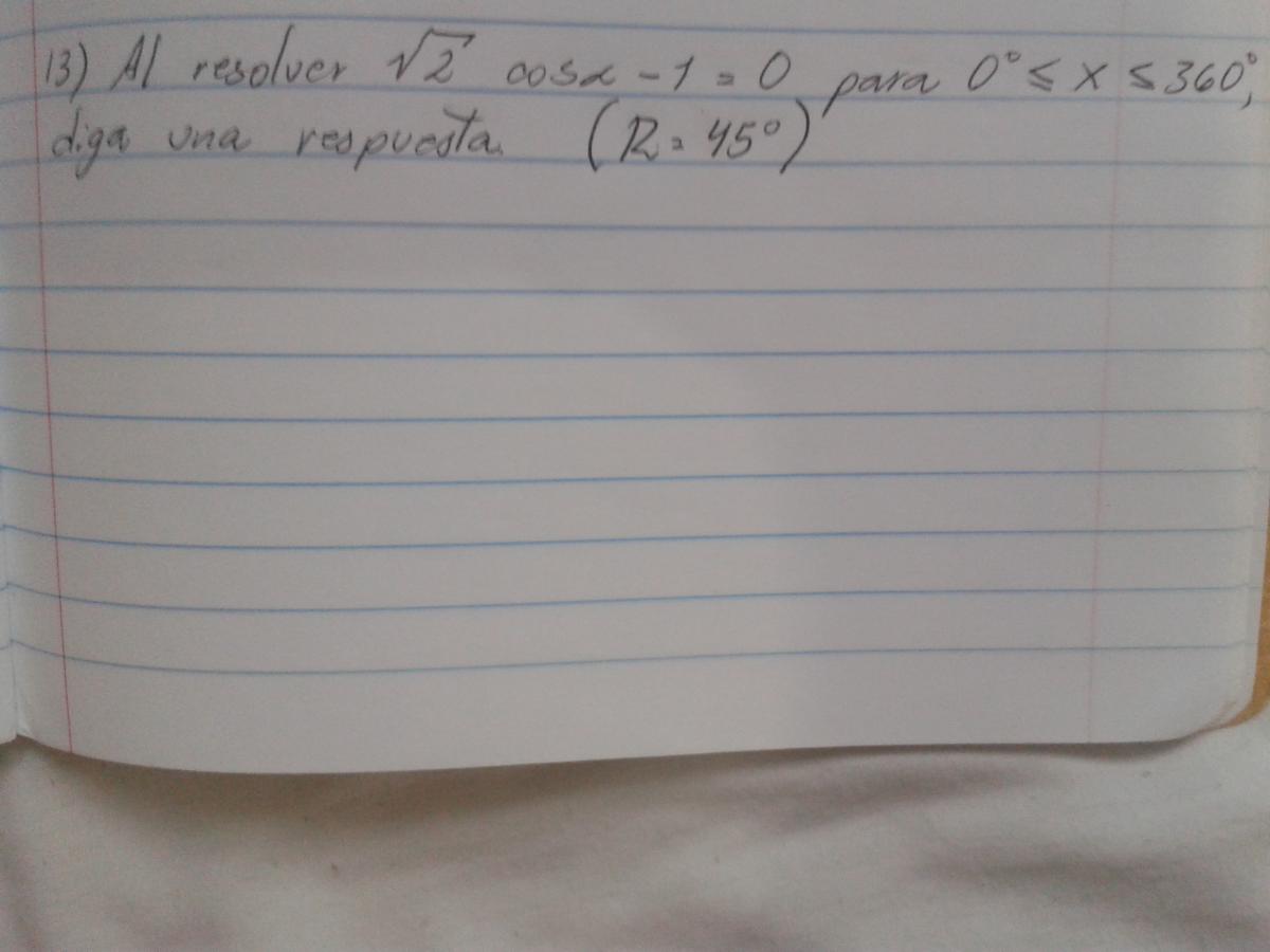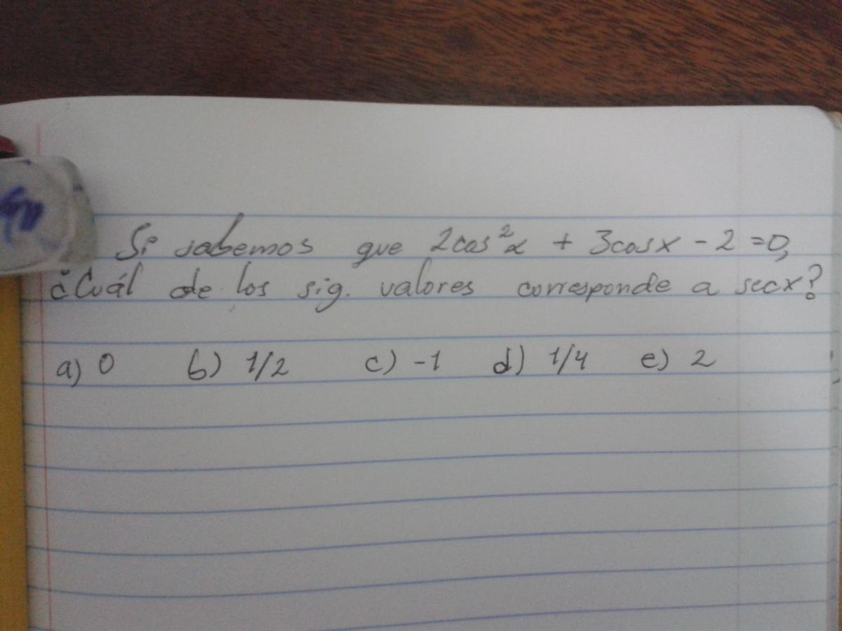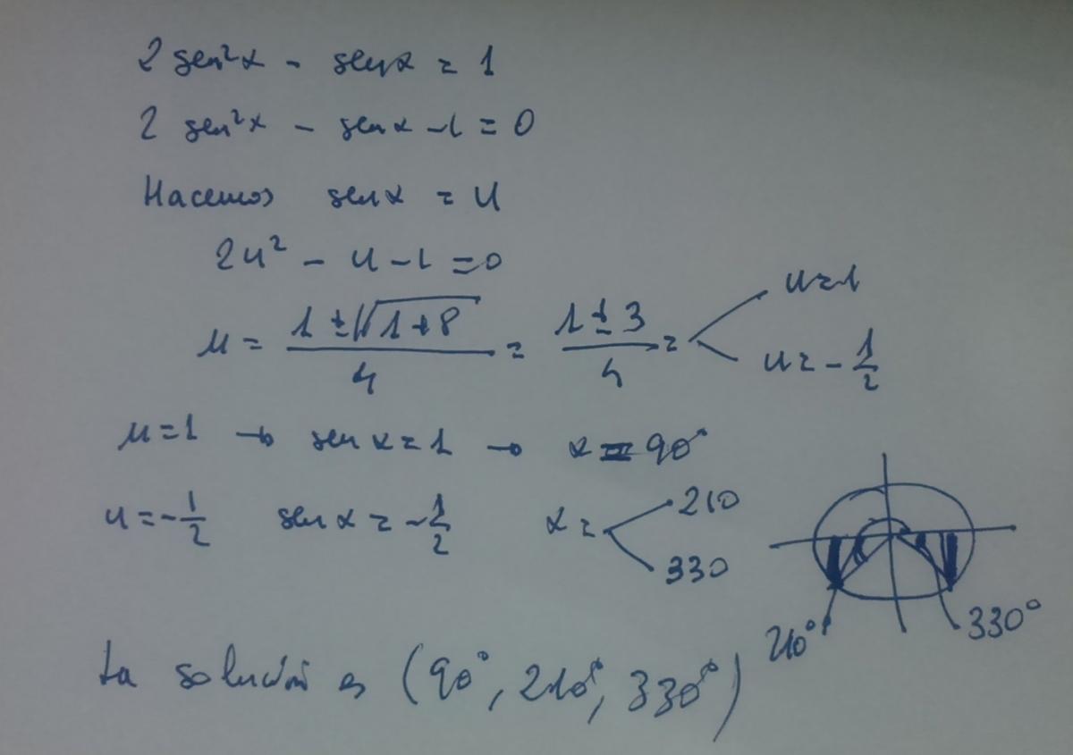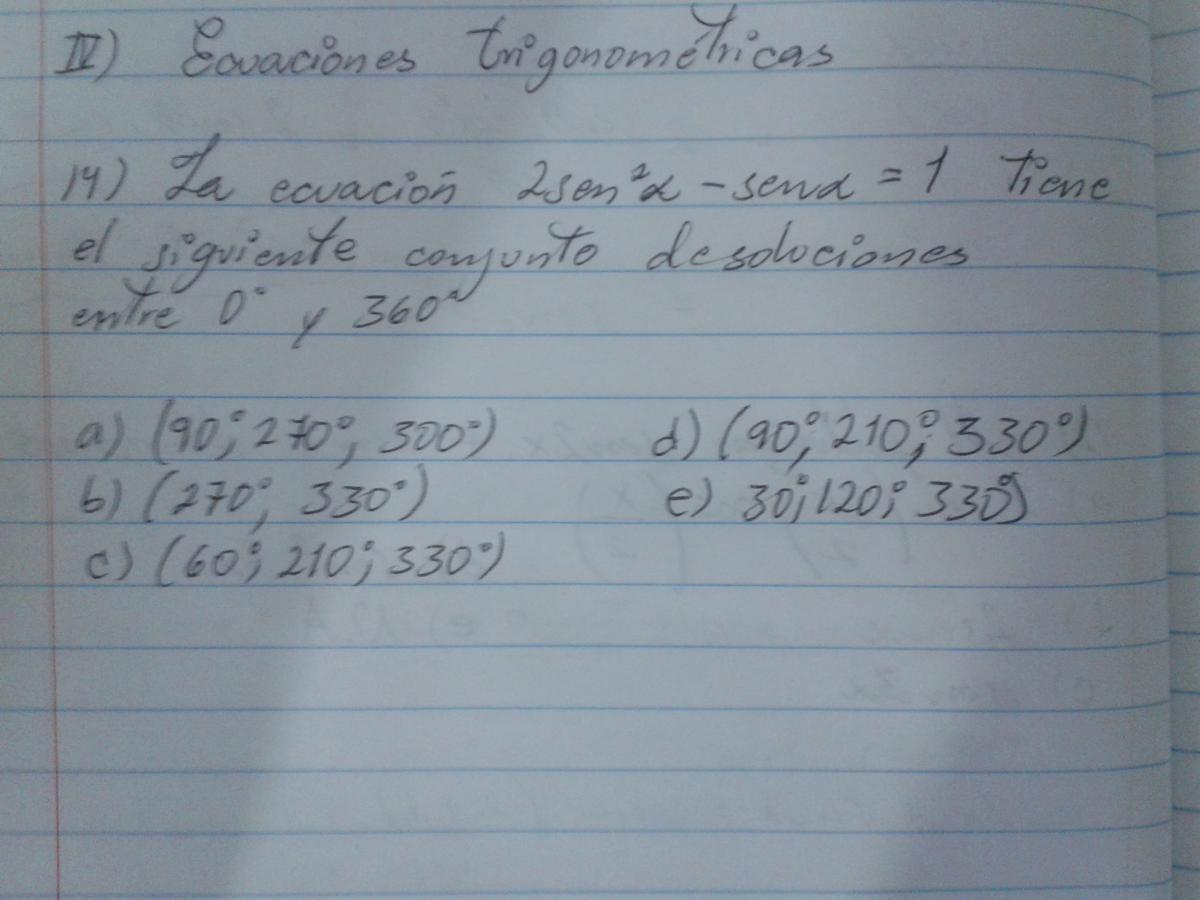 Unicoos, necesito de su ayuda: en el ejercicio pudee concluir que la ecuacion tiene como conjunto solucion entre 0 a 360º los conjuntos soluciones 30º y 90º qur hacen cierta esa igualdad. Pero la solucion del ejercicio me dice que es la opcion e) (90º,120º,330º) ENTONCES QUISIERA QUR ME AYUDARAN A COMO INTERPRETAR O SABER COMO LLEGARON A ESE CONJUNTO SOLUCION.![]()