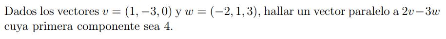 1) Llamemos: a = 2v - 3w = < 8 , - 9 , - 9 >, luego planteamos: p = < 4 , x , y >, y como tenemos que p debe ser paralelo al vector a, tenemos que p es múltiplo escalar de a, por lo tanto: