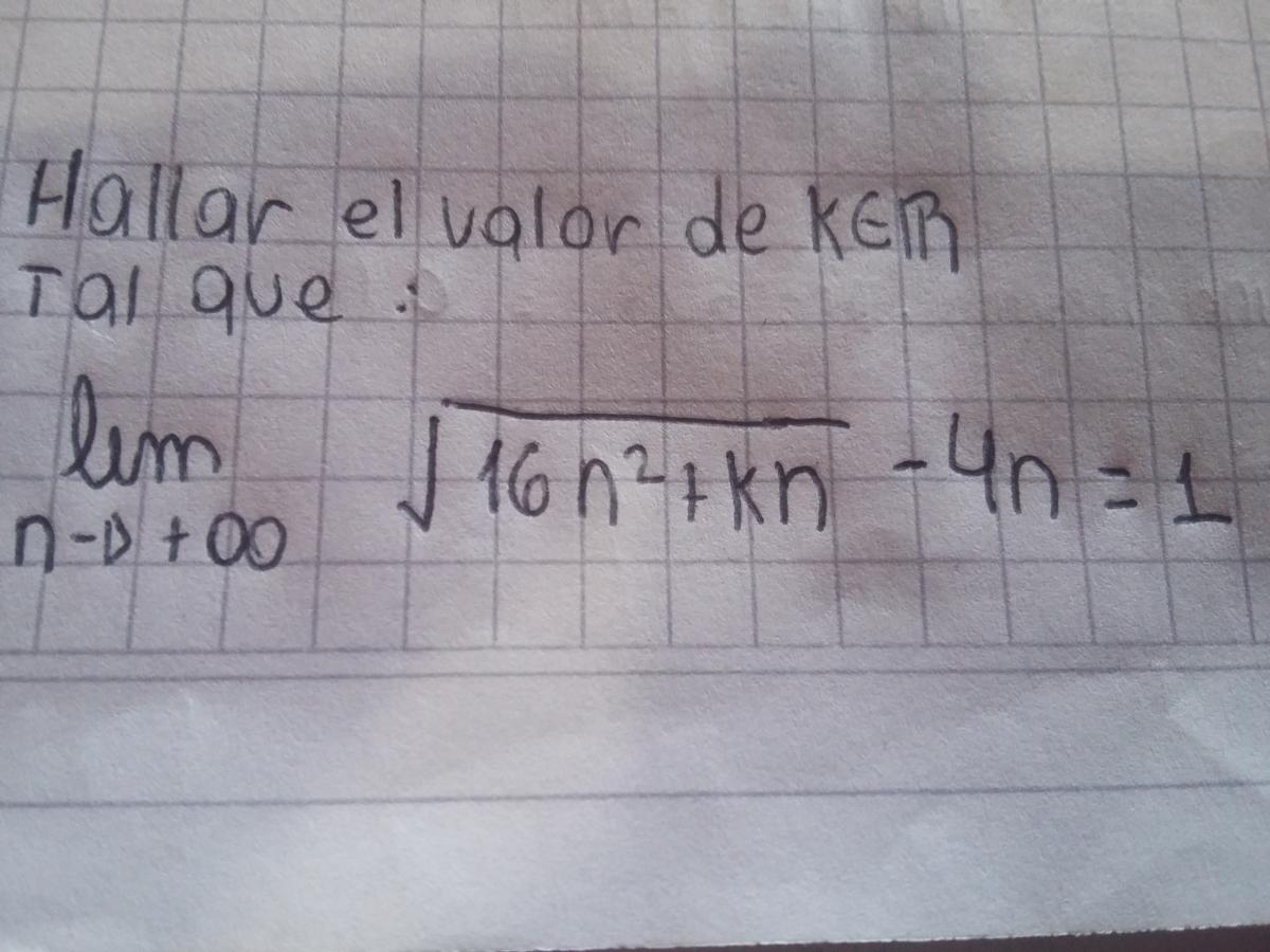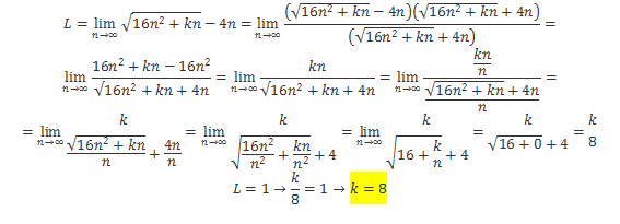 Observa que puedes multiplicar y dividir por ( V(16n^2 + kn) + 4n ), y te queda una expresión fraccionaria N/D, en la que tienes: