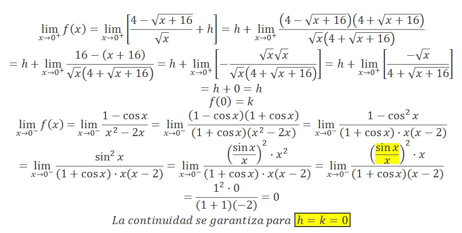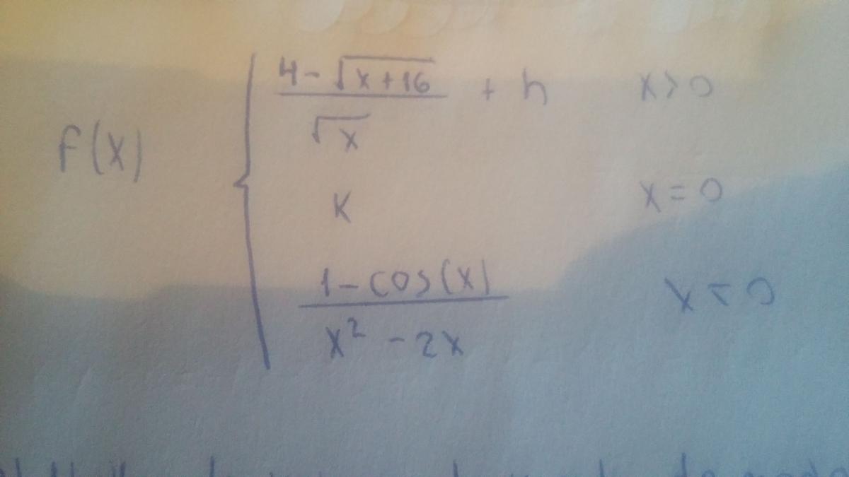 Hallar h y k de modo que f resulte continua hice el lim de x tendiendo a 0 por derecha y me queda 0/0 lo que hice multiplicar por el conjugado arriba y abajo y me queda -x/ raiz de x por (4 raiz de x +16) y me trabe ayuda![]()