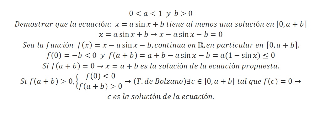 Parte sol: La función f(x)=x−a sen x−b es continua en R, por tanto lo es en [0,a+b].