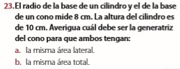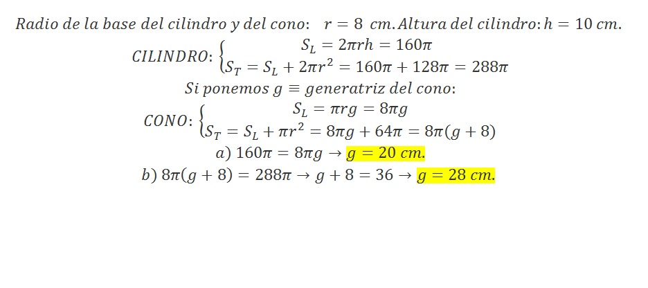 Luego, si preguntan por la altura del cono, puedes apelar a la relación pitagórica entre el radio de la base del cono (R), su altura (H) y su generatriz (G): G = V(R^2 + H^2).